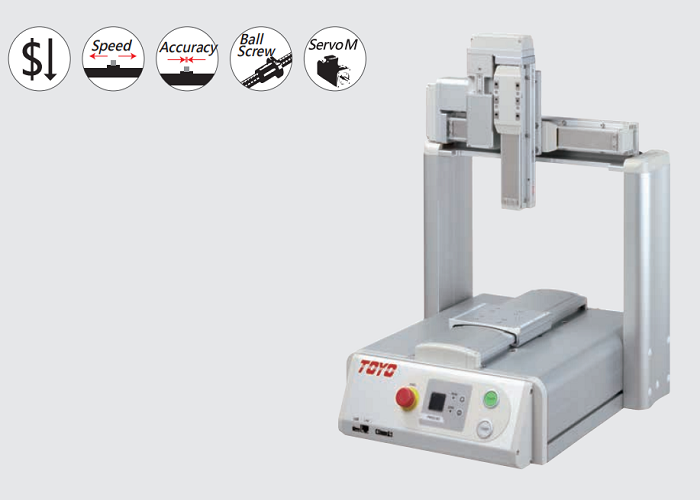 TOYO金年会jinnianhui桌上型机械手高精度、使用方便、结合专业开发之TOYO FSE软件做点胶机功能,使点胶涂布功能更加丰富。内建CAD转路径功能,可使教导更快,搭配CCD和Laser可以进行XYZ坐标补正,可做到路径的位置连续补偿。可应用于点胶、銲锡、视觉检测、精密对位等场合。